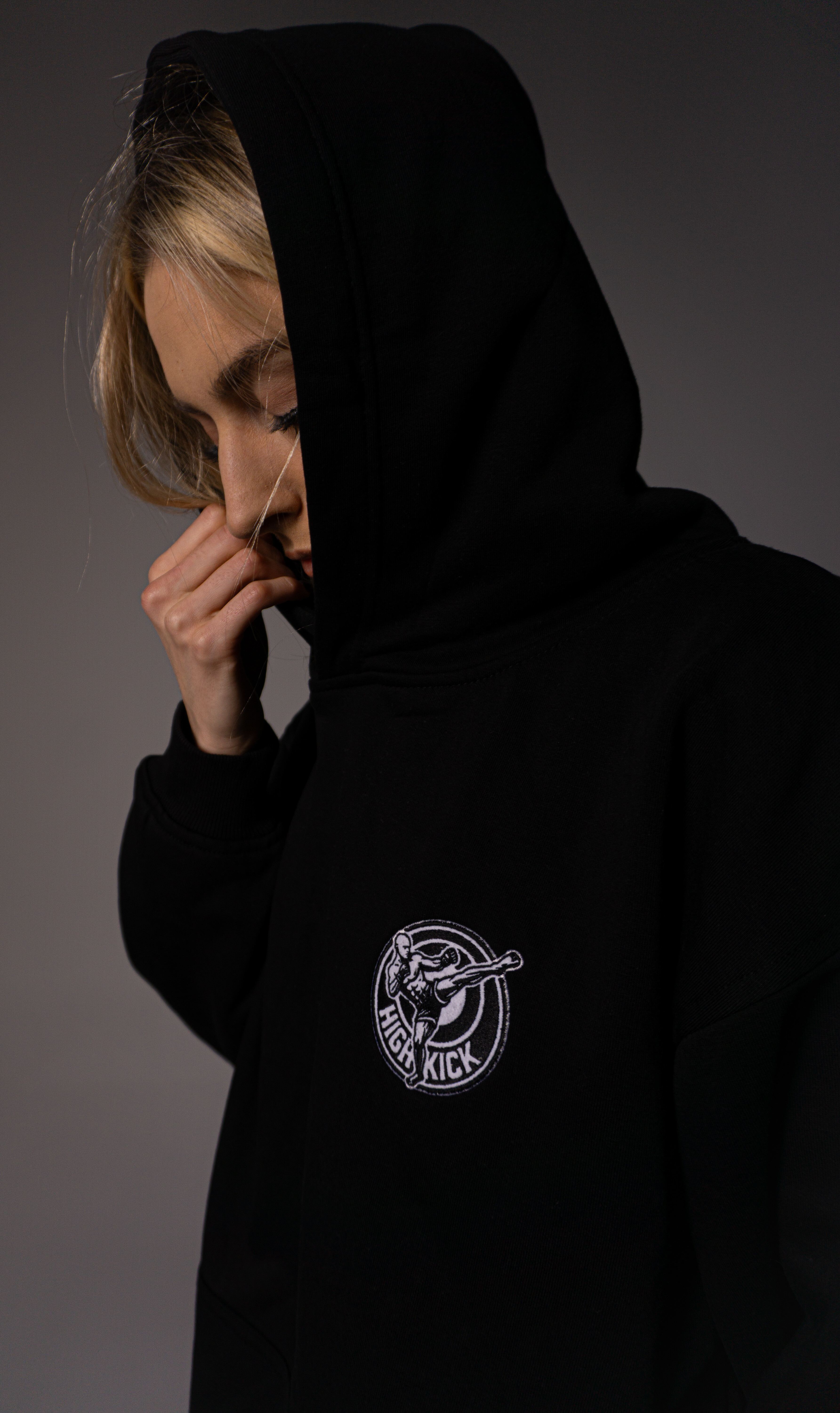 Bluza czarna HIGH KICK to połączenie minimalistycznego stylu i maksymalnego komfortu. Uszyta z miękkiej, wysokogatunkowej bawełny, posiada obszerny kaptur i dużą kieszeń typu kangurka. Na przodzie haftowany logo HIGH KICK, który nadaje całości charakteru streetwearowego i sportowego zarazem. Idealna na co dzień, trening i chłodniejsze dni.